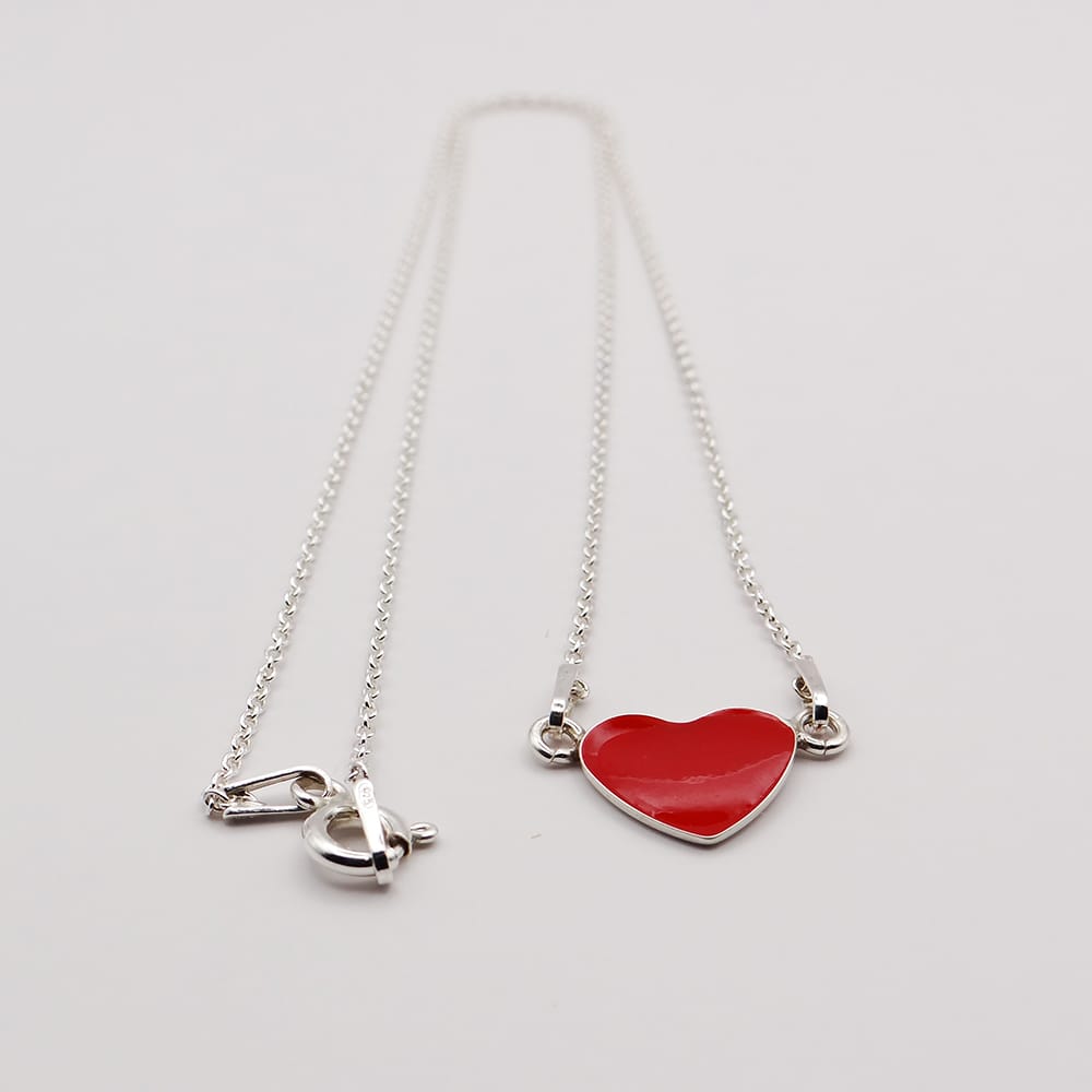 Ten naszyjnik powstaje w niewielkiej pracowni, gdzie liczy się dokładność i spokojne tempo pracy. Najpierw przygotowywane są elementy ze srebra próby 925, które tworzą delikatny łańcuszek i oprawę zawieszki. Następnie forma serca wypełniana jest czerwonym pigmentem zatopionym w żywicy, która po utwardzeniu uzyskuje gładką, błyszczącą powierzchnię przypominającą kamień. Każdy element jest starannie dopracowywany i wykańczany, aby zachować elegancję i trwałość biżuterii. Ponieważ każdy egzemplarz powstaje indywidualnie, drobne różnice w odcieniu lub strukturze są naturalnym efektem pracy ręcznej i świadczą o autentyczności produktu.