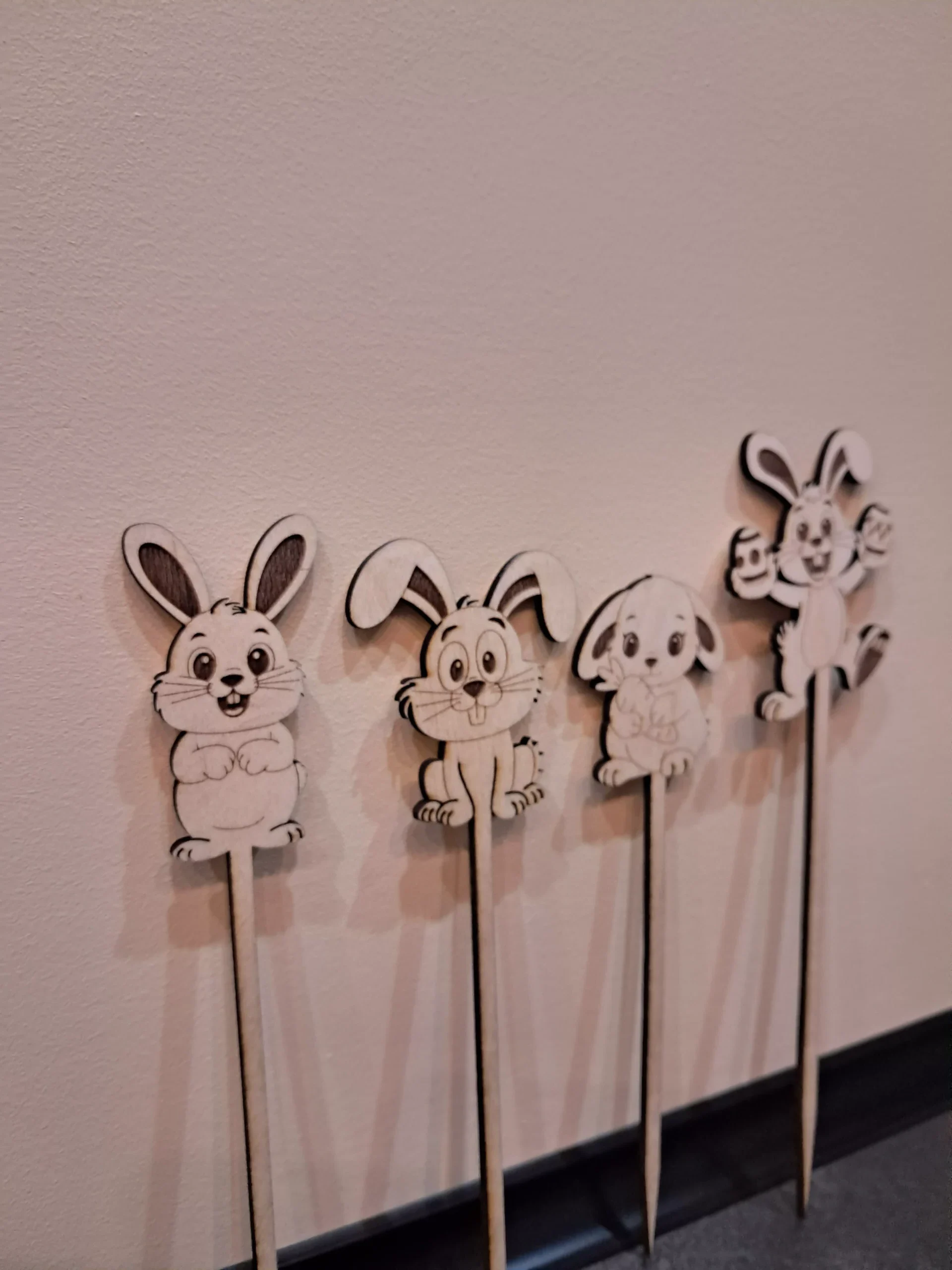 Wyobraź sobie wielkanocne śniadanie, na stole stoją babki, mazurki i kolorowe desery. Każdy wypiek ozdobiony jest innym zajączkiem, który nadaje mu wyjątkowy charakter. Jeden pilnuje marchewki, drugi z zaskoczeniem obserwuje świąteczny stół, trzeci przynosi pisanki, a czwarty spokojnie cieszy się atmosferą Wielkanocy. Taki zestaw topperów świetnie sprawdzi się podczas rodzinnych spotkań, przy dekoracji słodkiego stołu lub jako element świątecznego prezentu.